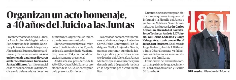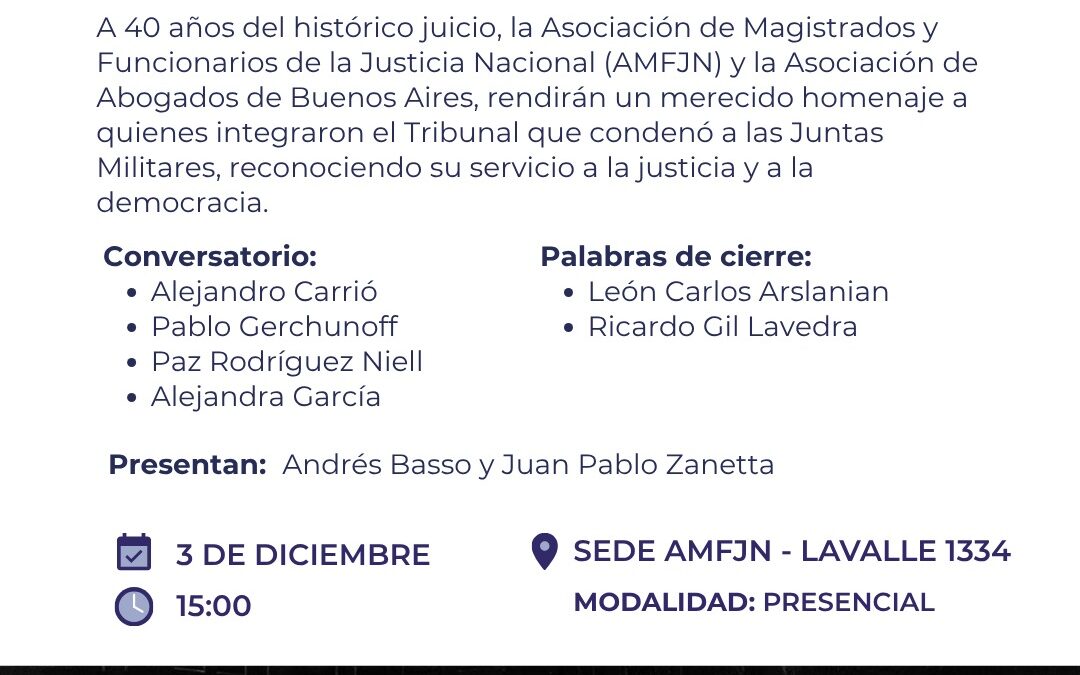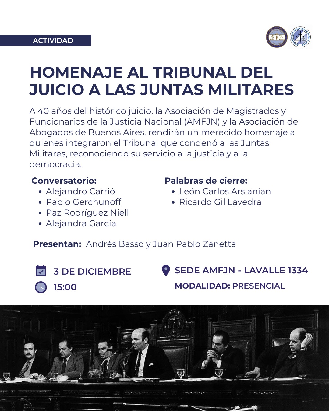 La Asociación de Magistrados y Funcionarios de la Justicia Nacional y la Asociación de Abogadas y Abogados de Buenos Aires invitan a participar del acto en homenaje a quienes llevaron adelante el histórico Juicio a las Juntas Militares, un hito esencial en la consolidación de nuestra democracia y en la defensa de los derechos humanos en Argentina.